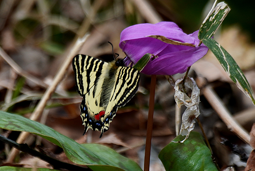 森のカタクリが沢山咲いています。 三月下旬から春の女神を待っていましたが寒かったせいか今月4日まで姿を見ていませんでした。 翌日は天気が良かったのでそろそろと思いいつもの場所で待つことにしました。 日が差して暖かくなるとカタクリの周りを飛び回り吸蜜したり地面で翅を広げたりと三頭が観察されました。 別の場所でも見られたようです。 三月末に補助飼育の蝶が羽化し放蝶したそうですので自然発生のものかどうかは分かりません。 お終いは幼虫の食草となるトウゴクサイシンです。