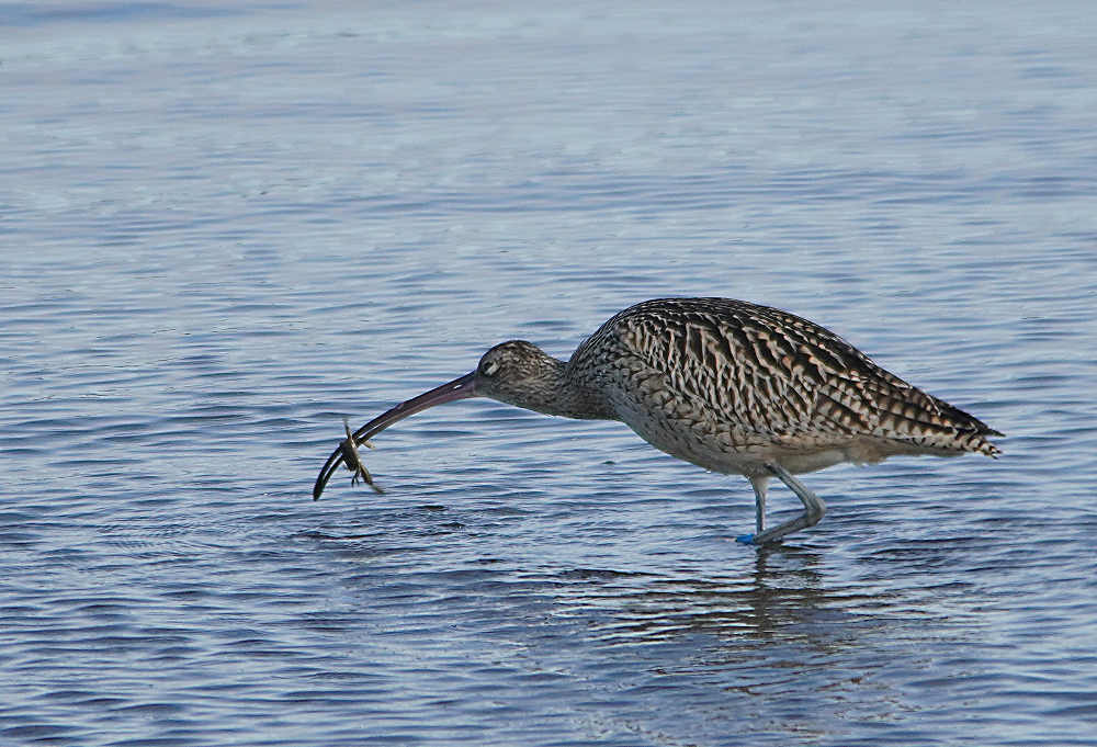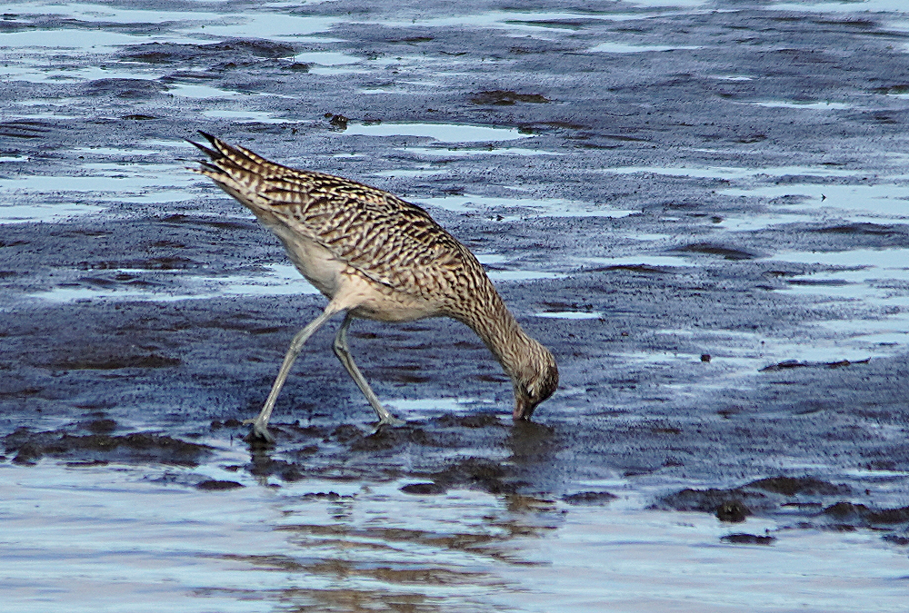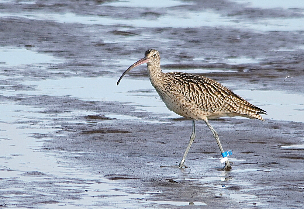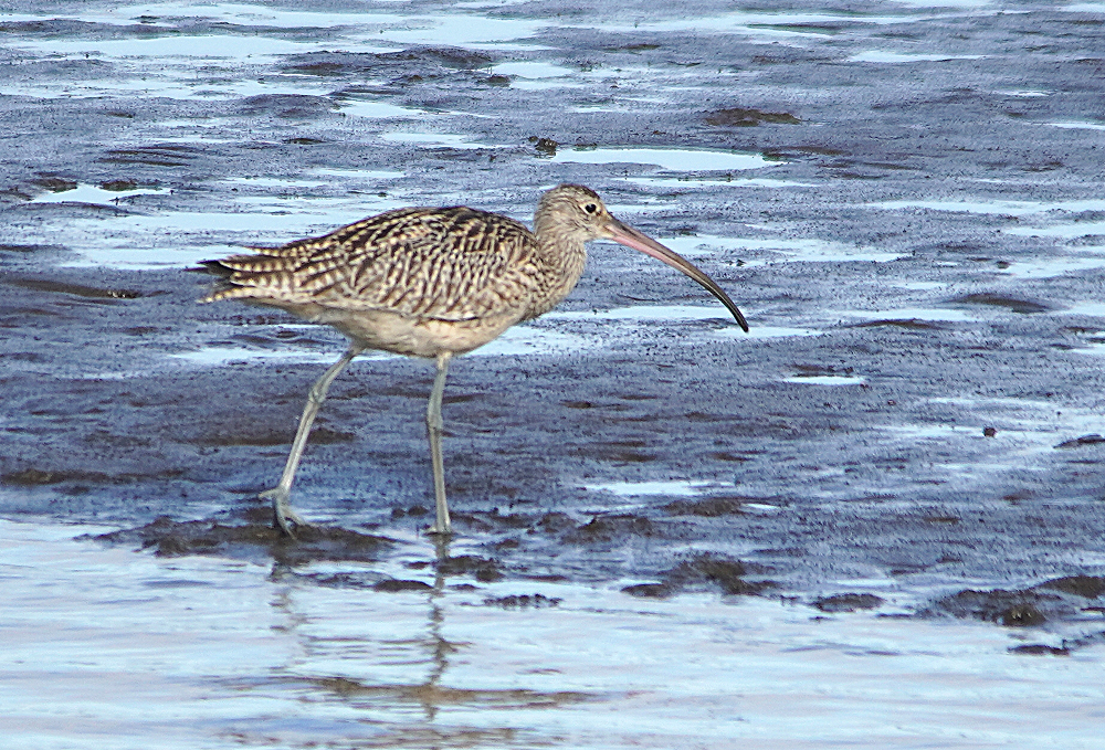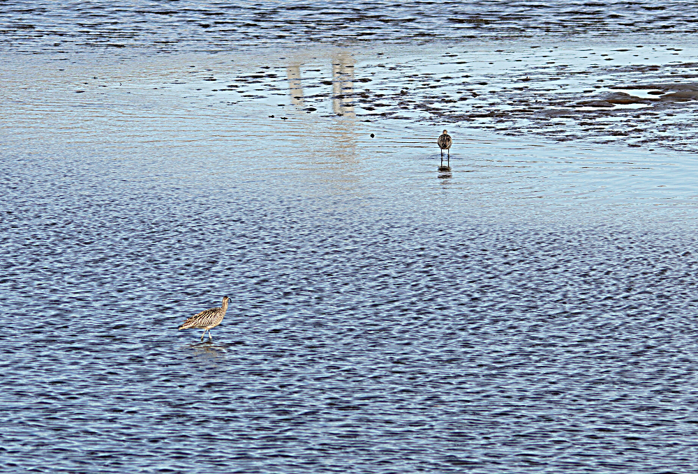 潮が引き始めた浅瀬でホウロクシギ二羽が採餌中でした。 一羽は成鳥でフラッグと足環が付けられ、もう一羽は嘴が少し短く体長もスリムで若鳥のようです。 こんな近くで撮れたのは久々です。 二ヶ所目の干潟を覗くとミヤコドリが採餌中でした。 恐らく蒲生にいた個体がこちらに移動したものと思われます。 相変わらずクレーン作業で一部しか観察できませんでした。