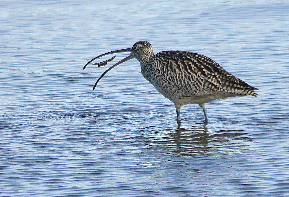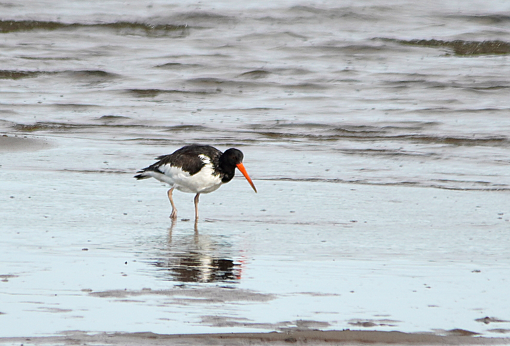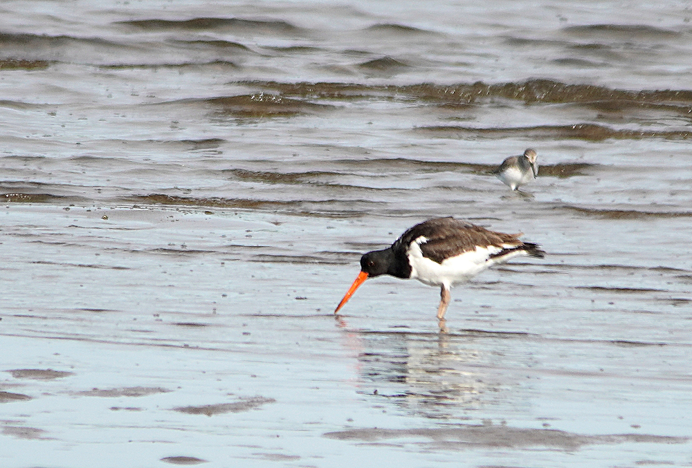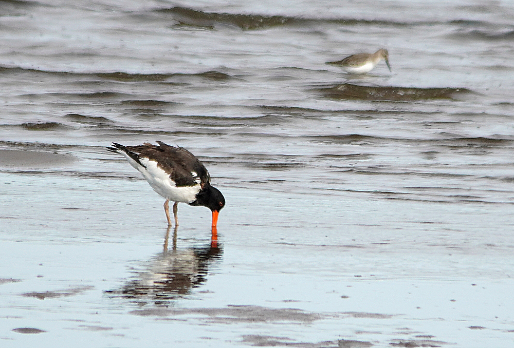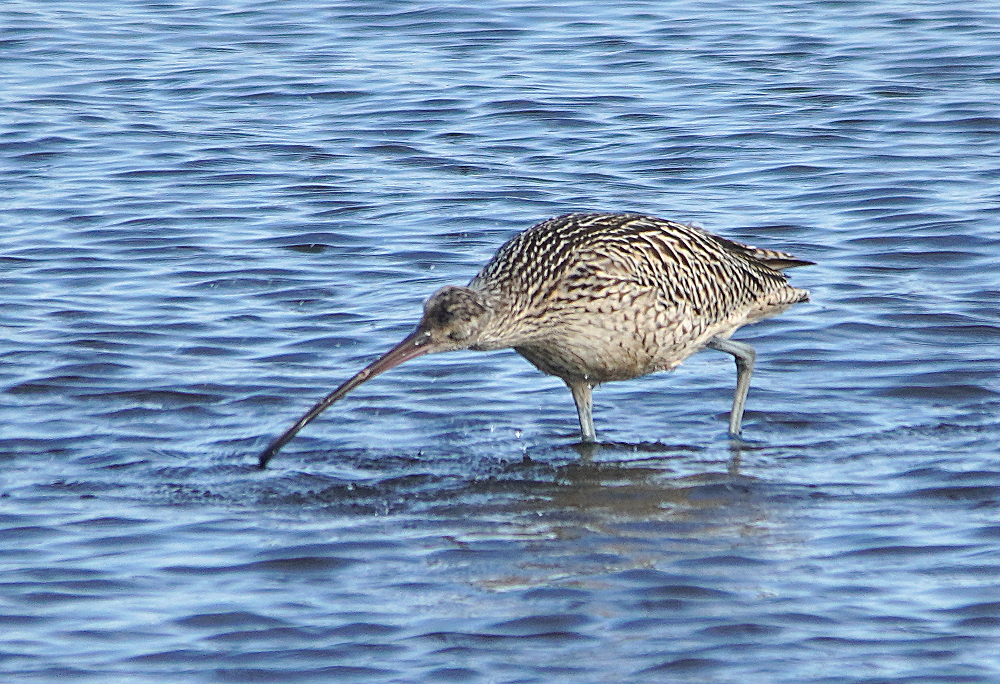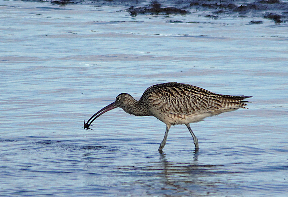潮が引き始めた浅瀬でホウロクシギ二羽が採餌中でした。 一羽は成鳥でフラッグと足環が付けられ、もう一羽は嘴が少し短く体長もスリムで若鳥のようです。 こんな近くで撮れたのは久々です。 二ヶ所目の干潟を覗くとミヤコドリが採餌中でした。 恐らく蒲生にいた個体がこちらに移動したものと思われます。 相変わらずクレーン作業で一部しか観察できませんでした。