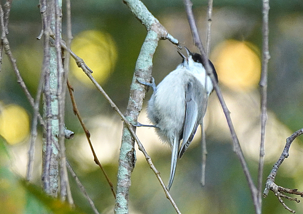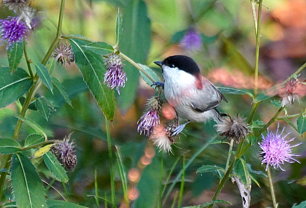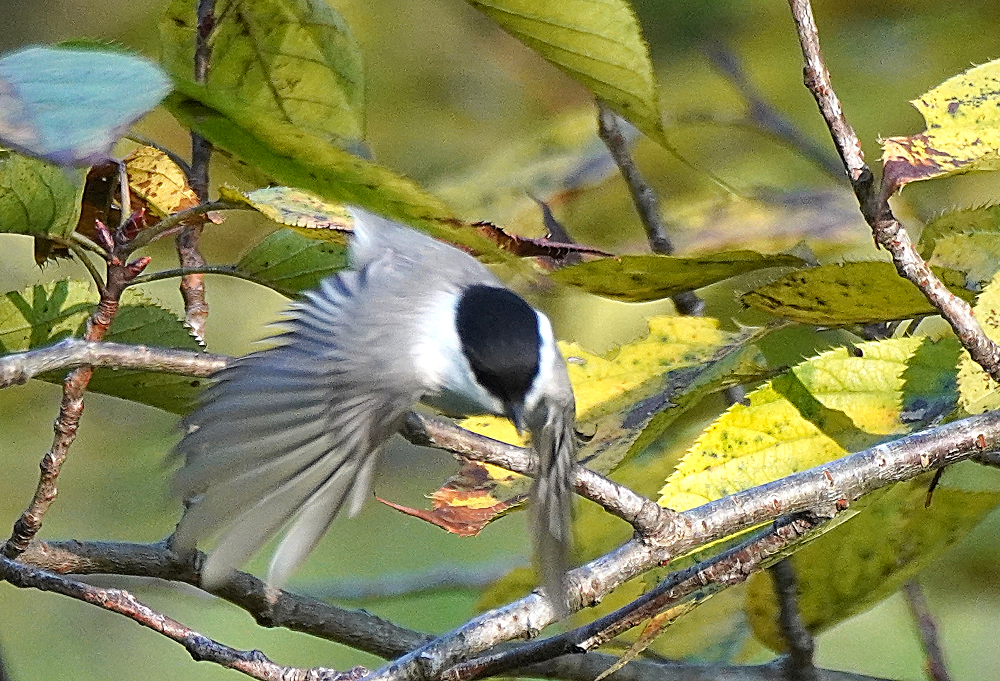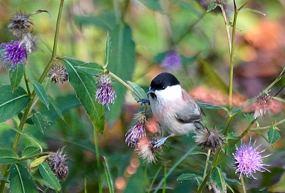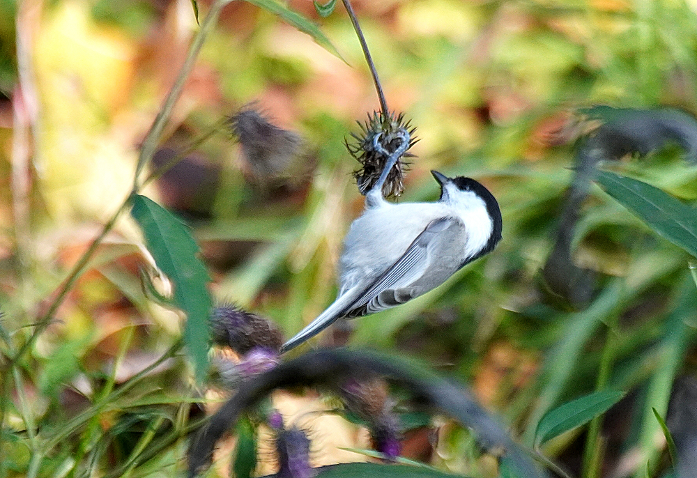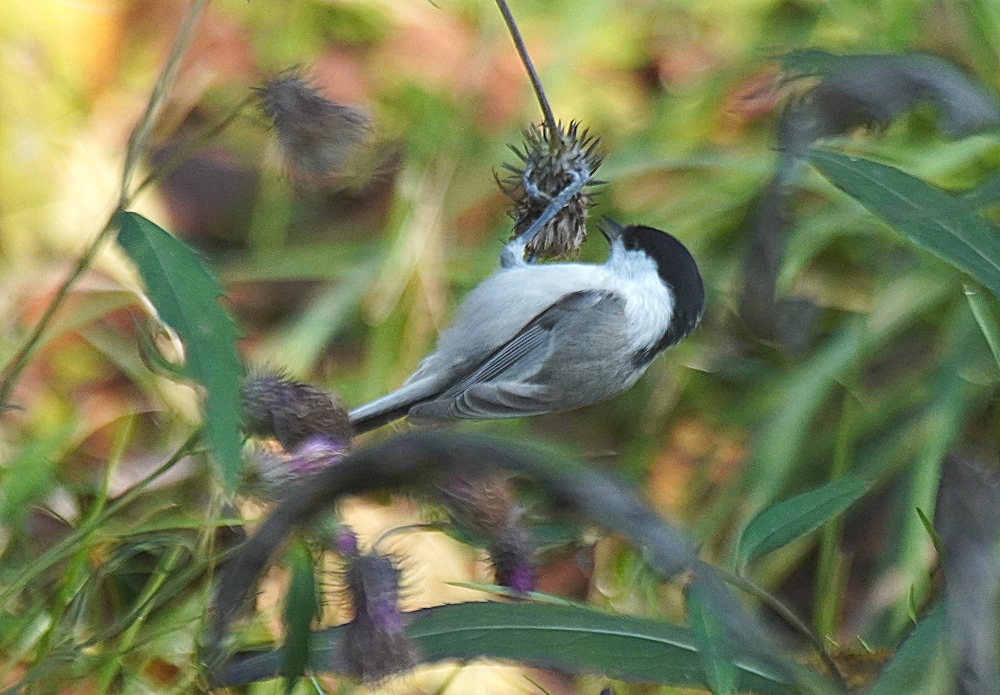 公園に十月中頃からコガラが飛来しています。 コガラは泉ヶ丘山麓や蔵王で良く見かけます。 冬期にかけて山から下りて来ますがここで観察されるのは珍しいことです。 この日は5~6羽の群れでアザミの種子を啄み食べていました。 今季は雑草の刈り掃いが行なわれなかったところにアザミなどが咲きました。 その実を食べて飛び回っています。 ゴジュウカラも滞在していますがヒガラは見当たりません。