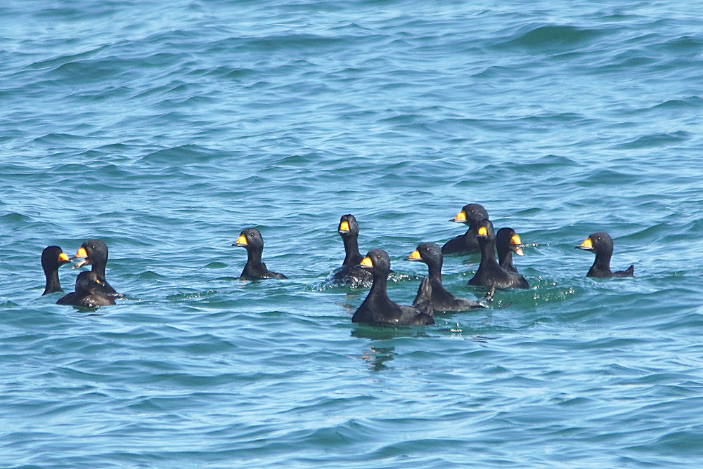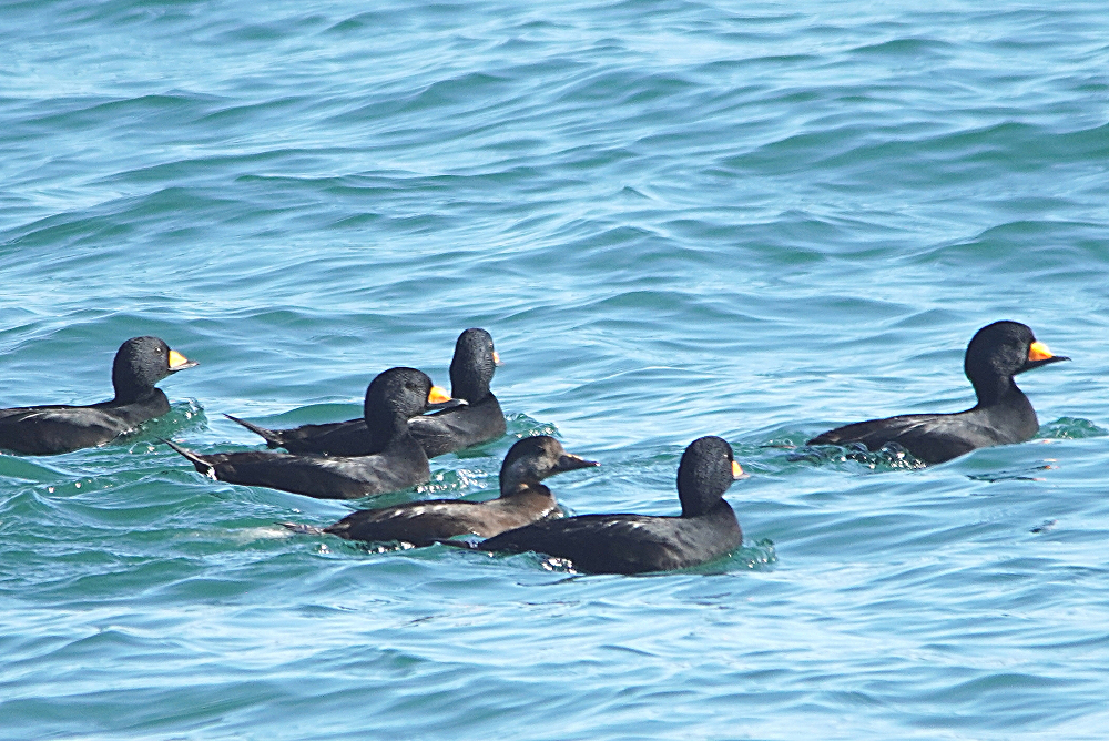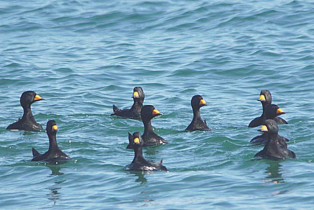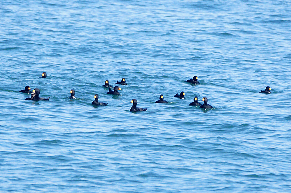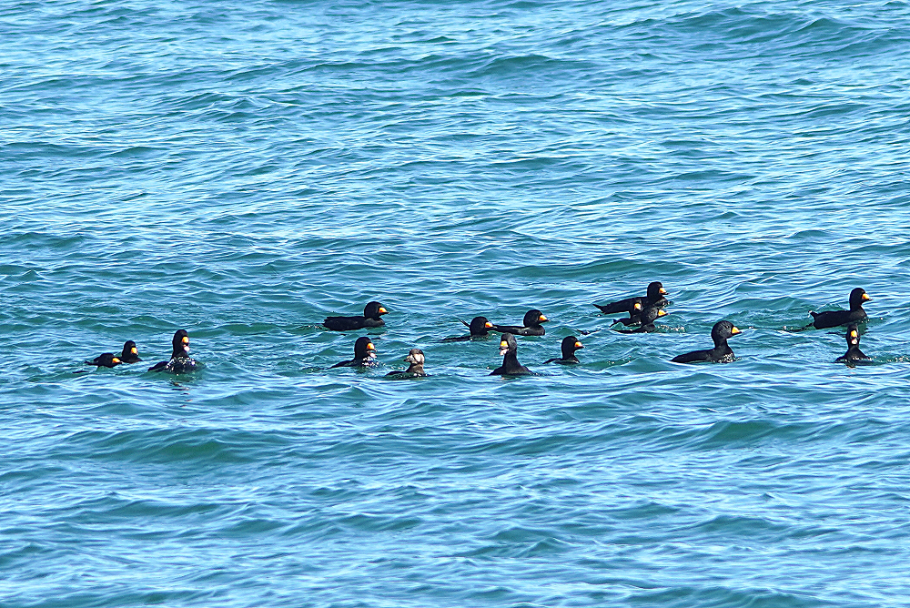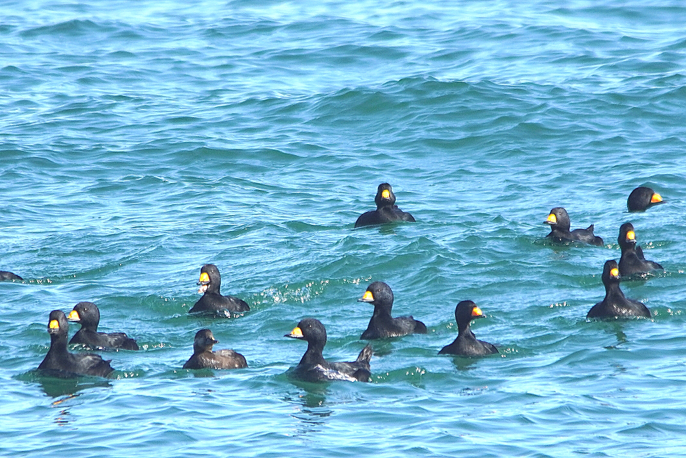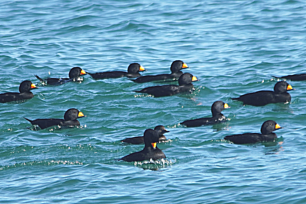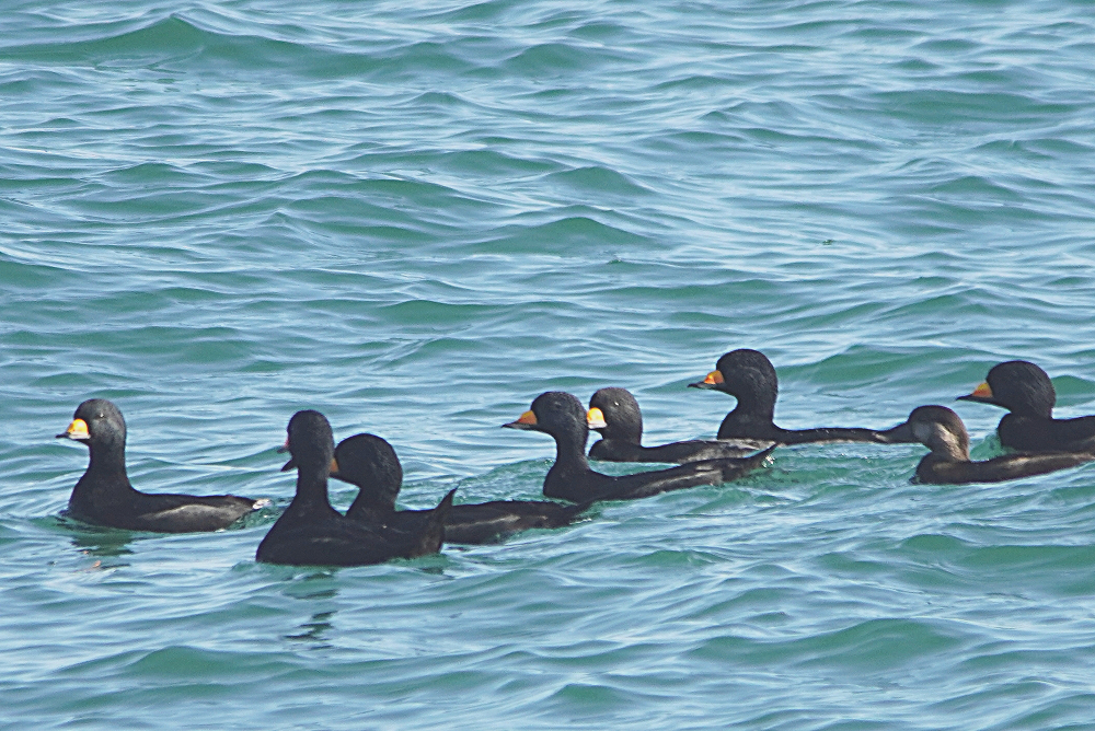 シノリガモを撮っていたらクロガモの鳴き声が微かに聞こえました。 沖合から岸に向かっている二十羽程の群れが見えました。 三度目でやっと捉えることができました。 ヘッドランド近くまでやって来ましたが釣り人が来て沖合に戻ってしまいました。 沖合にいると鳴き声が聞こえないので見過ごしていたかもしれません。 オスの中にメスが二羽だけでした。 この日はオスの突進や飛び回ったりしてメスの気を引くような行動はありませんでした。