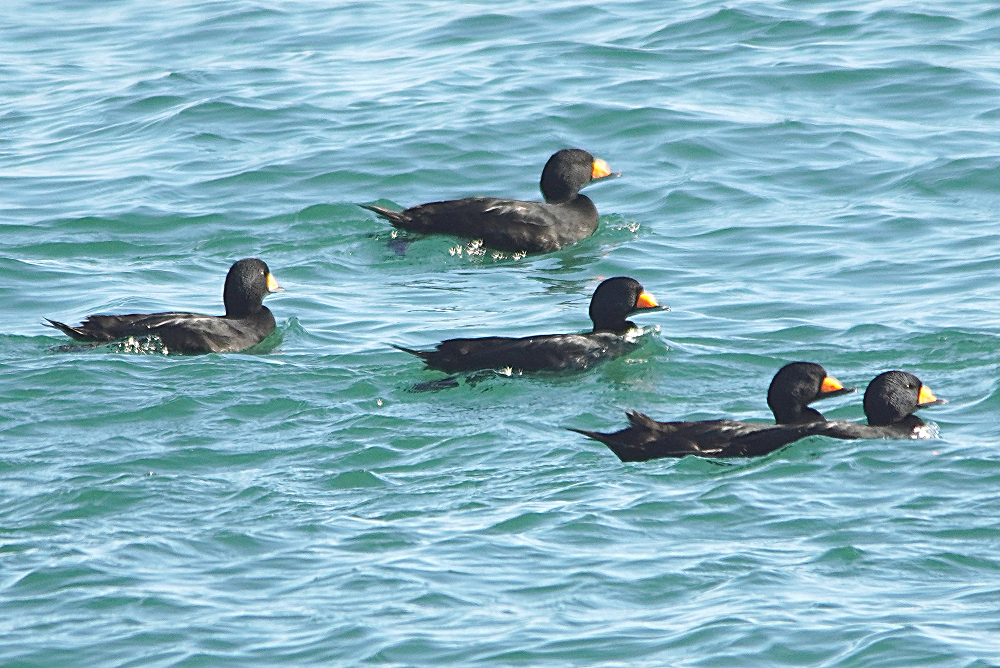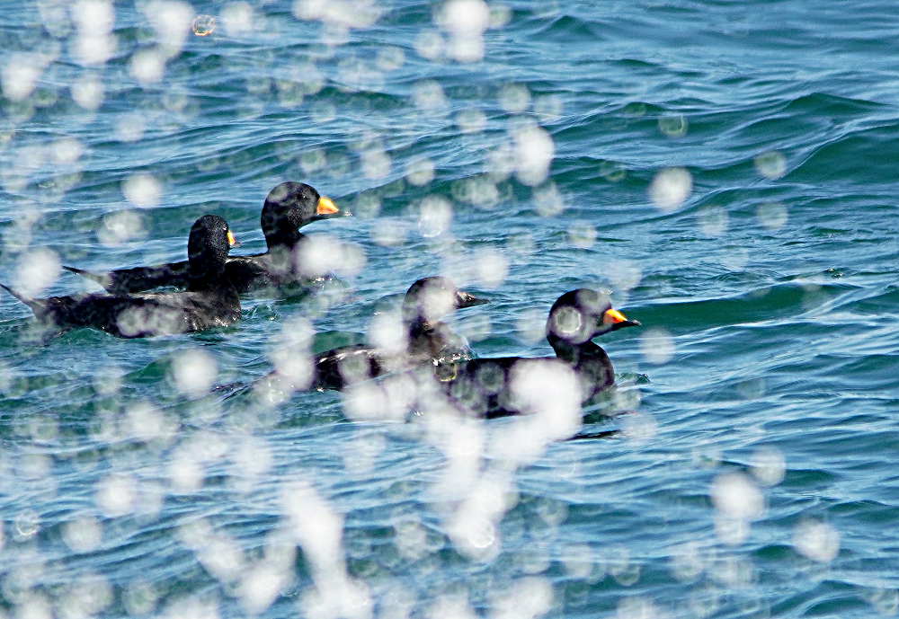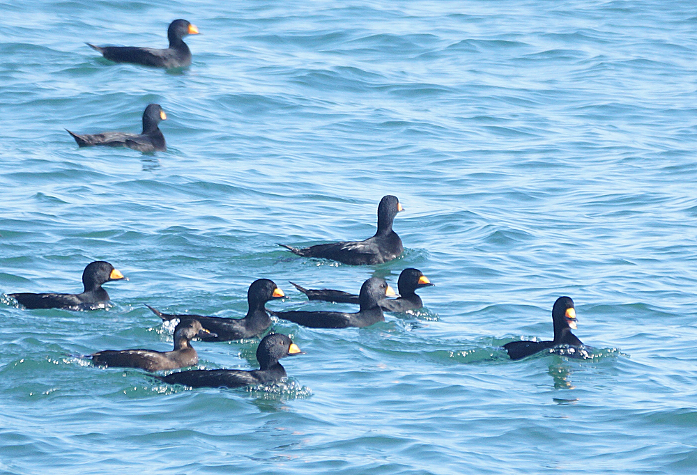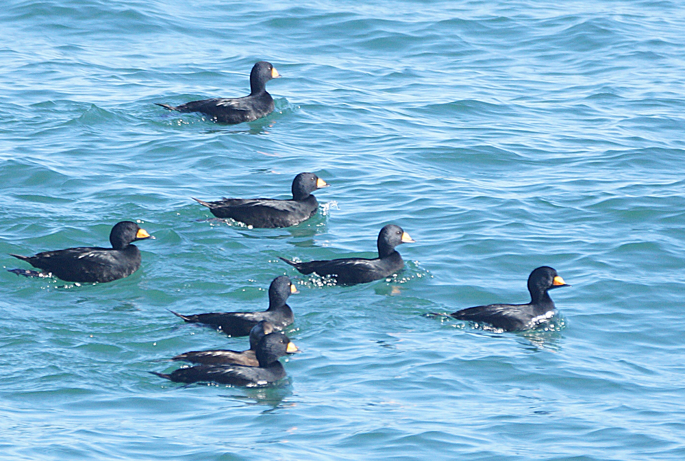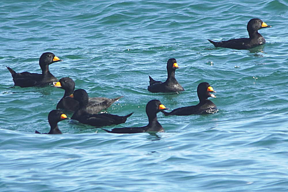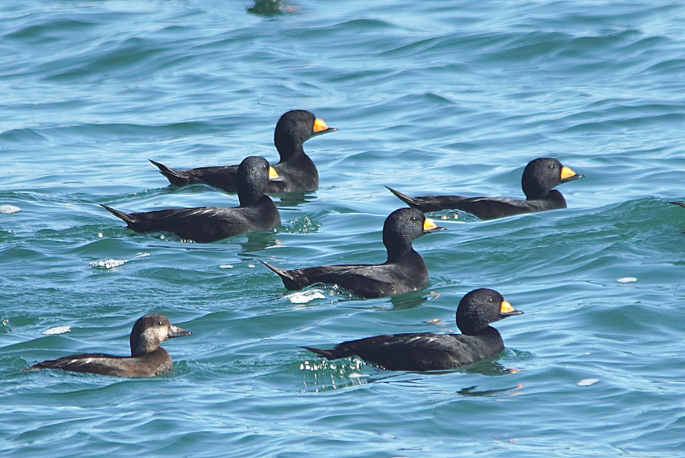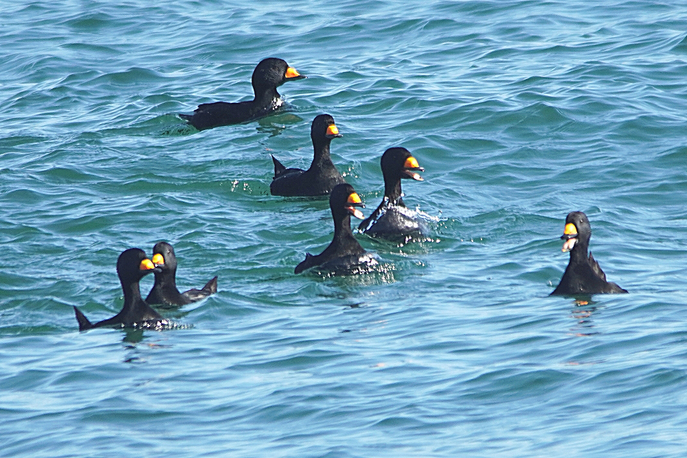 シノリガモを撮っていたらクロガモの鳴き声が微かに聞こえました。 沖合から岸に向かっている二十羽程の群れが見えました。 三度目でやっと捉えることができました。 ヘッドランド近くまでやって来ましたが釣り人が来て沖合に戻ってしまいました。 沖合にいると鳴き声が聞こえないので見過ごしていたかもしれません。 オスの中にメスが二羽だけでした。 この日はオスの突進や飛び回ったりしてメスの気を引くような行動はありませんでした。