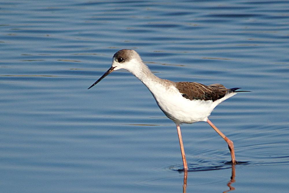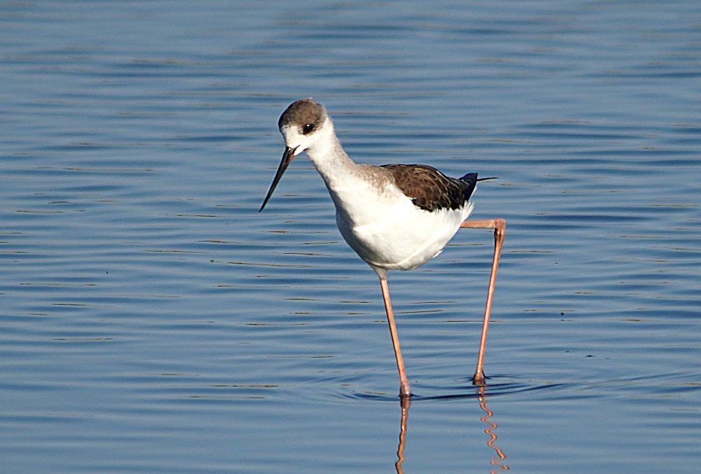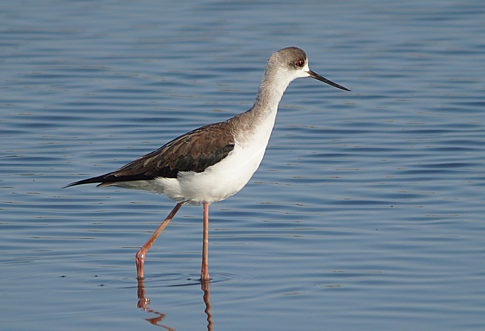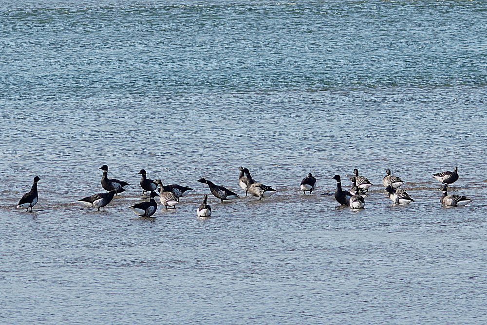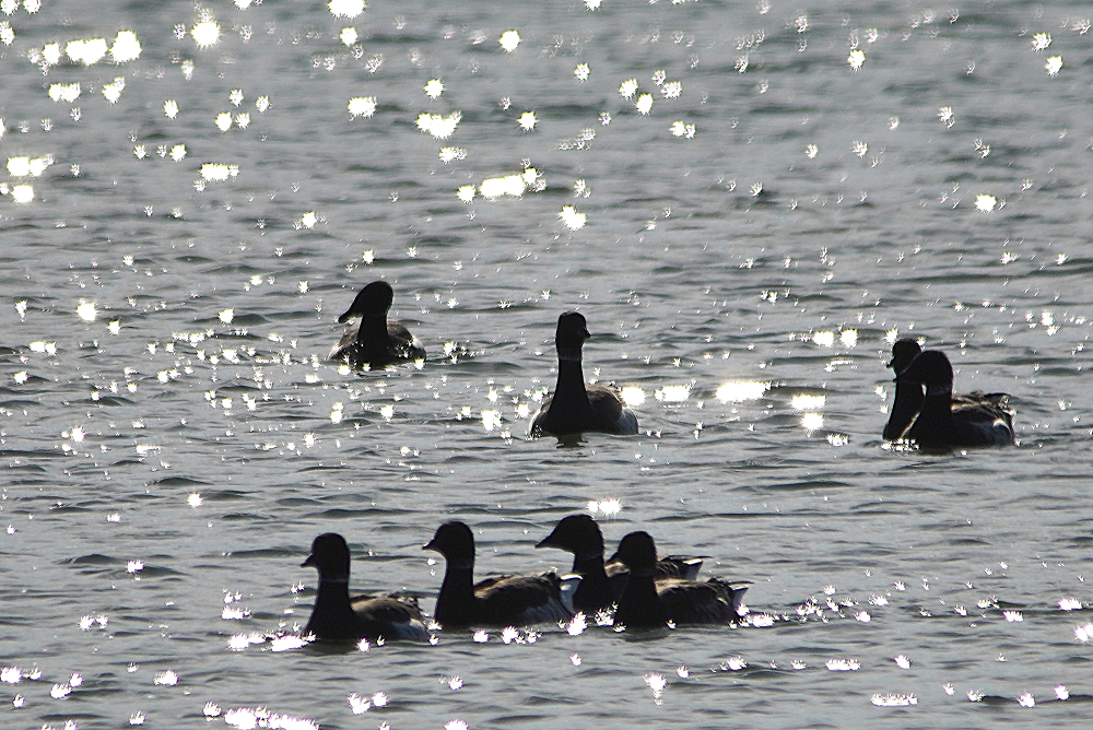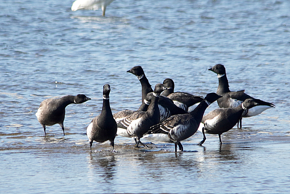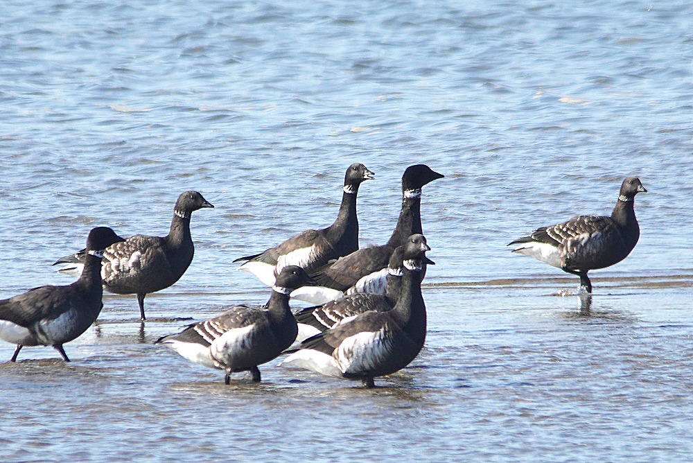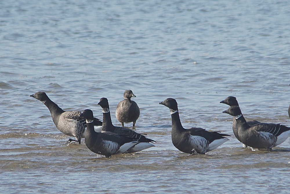 河口にコクガンが二十羽程いました。 潮が満ちてくると少しづつ移動を始めます。 いつも休んでいる場所は順光ですがここは逆光です。 沖合に飛び立つことなく休んでいました。 赤沼にセイタカシギ一羽がいました。 カモ類が餌場に行っているので自由に採餌してました。