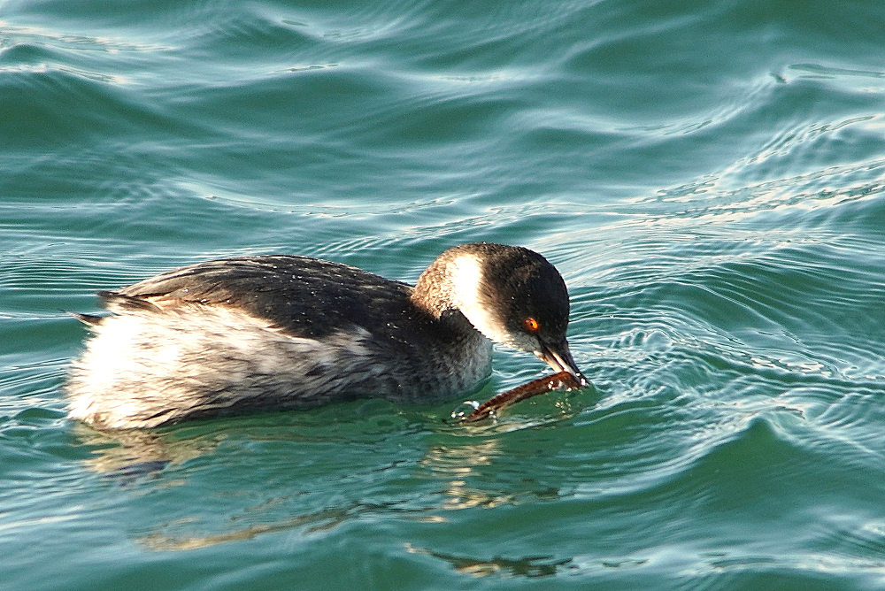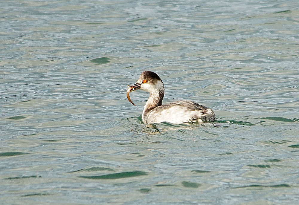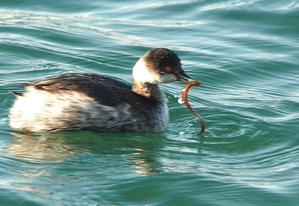 漁港の航路で少し大き目の水鳥が潜水していました。 船が航行する度に潜水し離れた所に浮上します。 それでも逃げないで居るので撮れました。 ハジロカイツブリがギンポを捕まえて暫く格闘し弱ったところを呑み込みました。 ミミカイツブリを見つけましたが逆光で上手く撮れません。 カイツブリの仲間三種です。