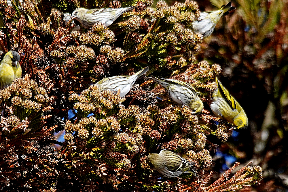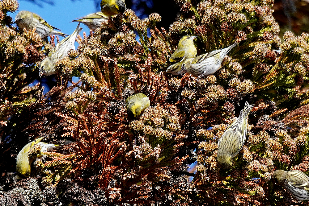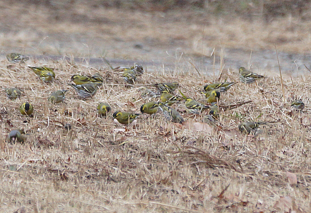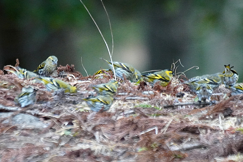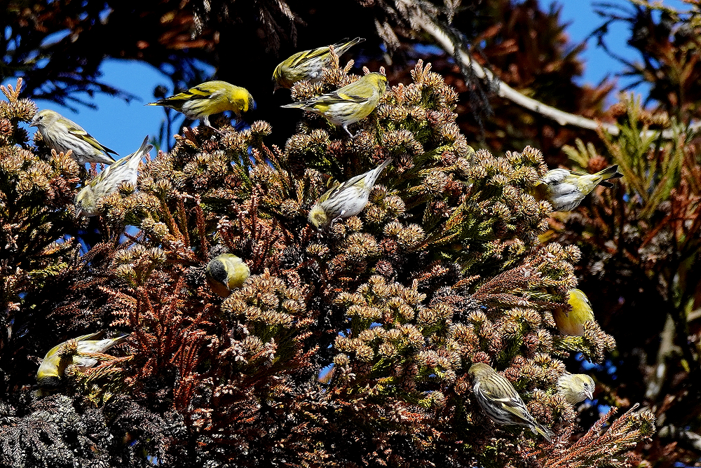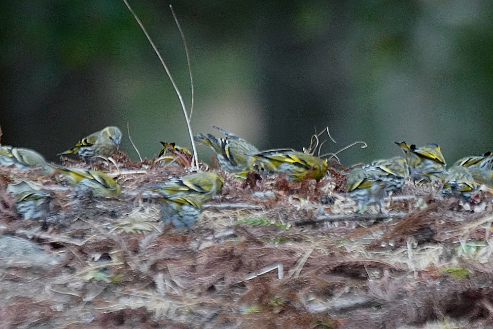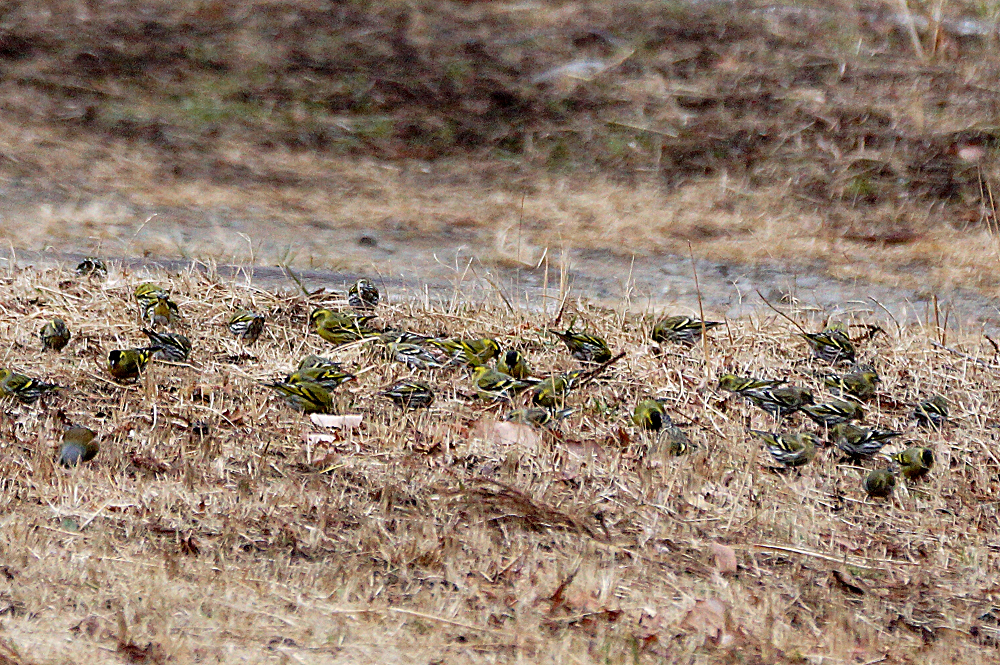 マヒワの群れが杉木に止まり採餌中でした。 五十羽以上でしょうか杉の種子を啄んでいました。 杉の葉に入り込んで姿が隠れているものが多いです。 ただ、何かに驚いて一斉に飛び出しじっとしていません。 強風の翌日には地面に落下した種子を食べています。 雪の上だと良いのですが枯葉や枯れ枝の上です。 それでも大群で見られるのは今のところマヒワだけです。