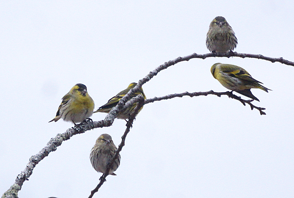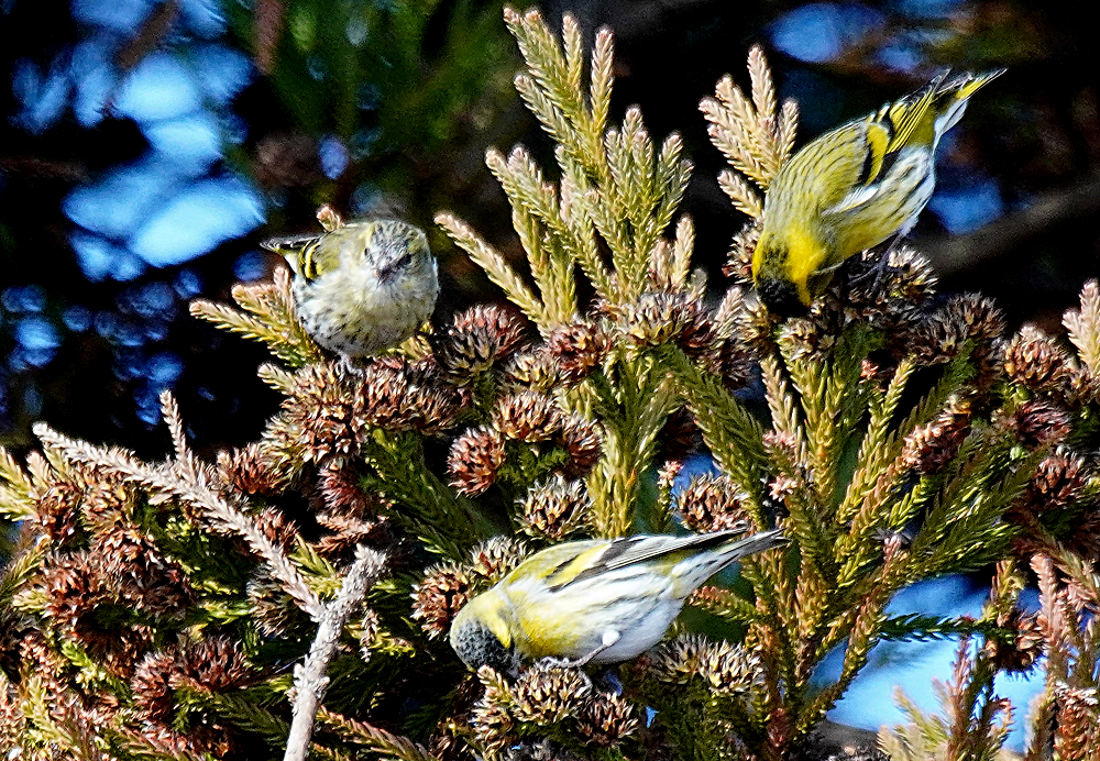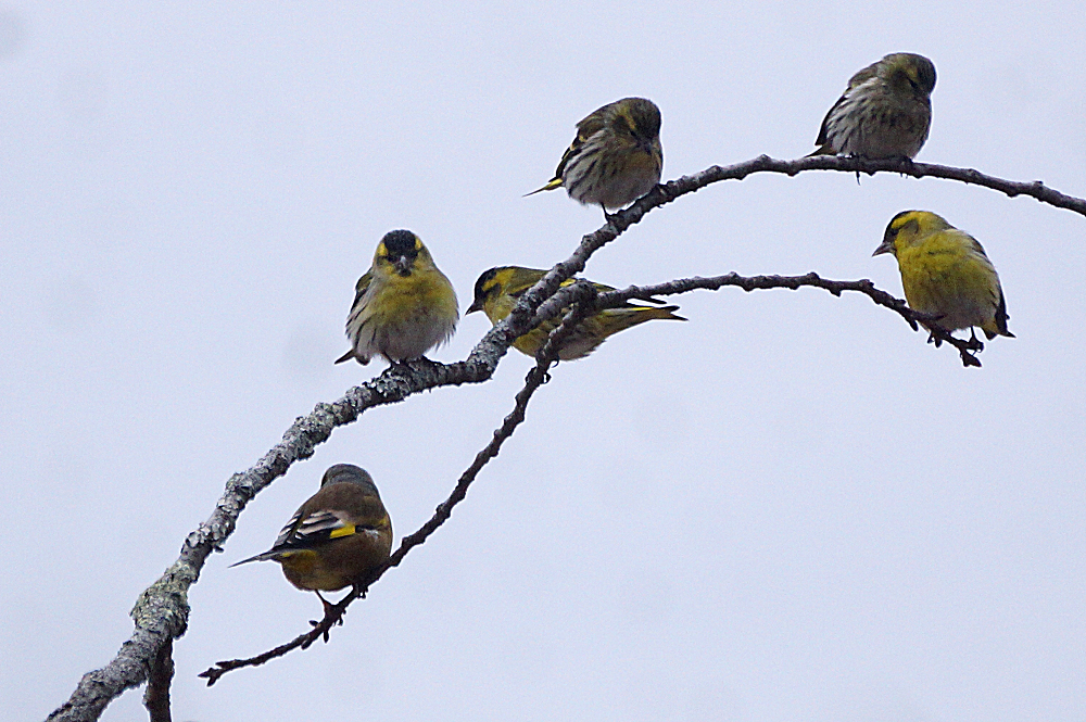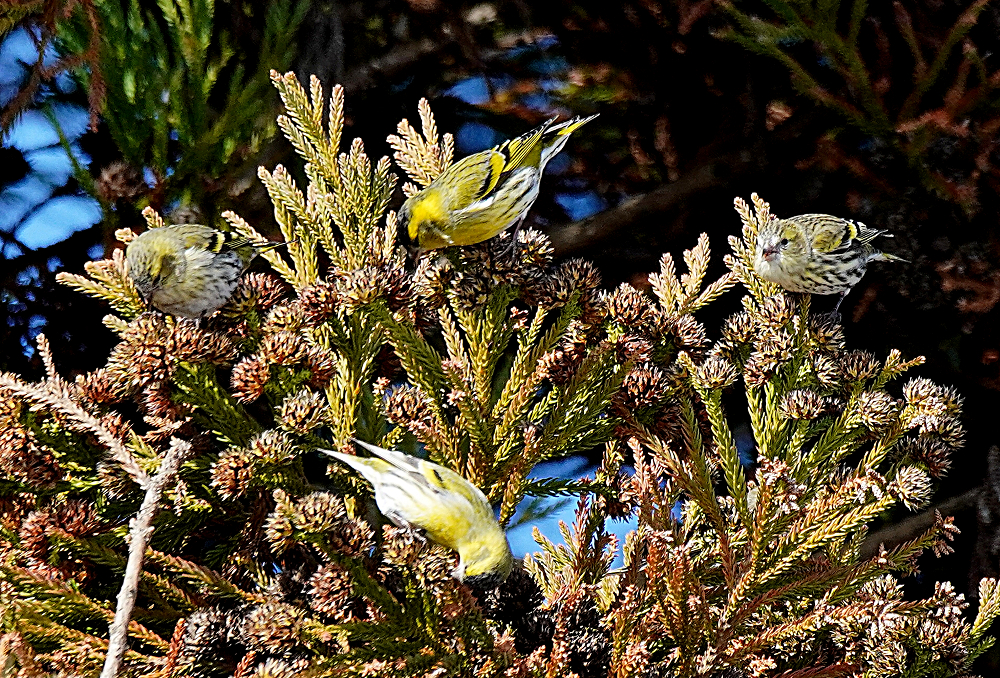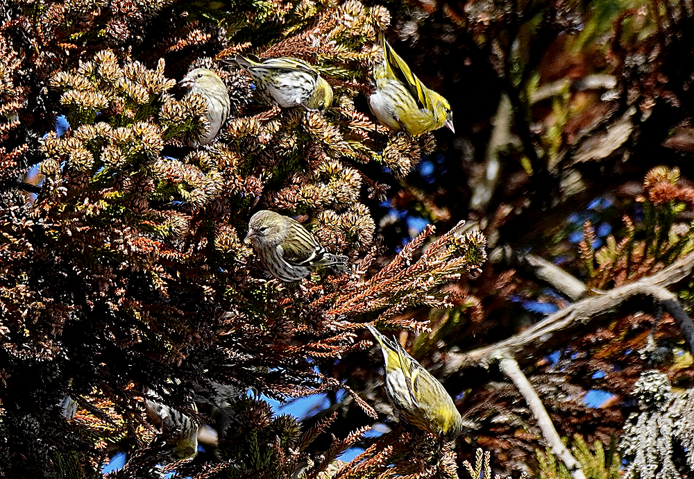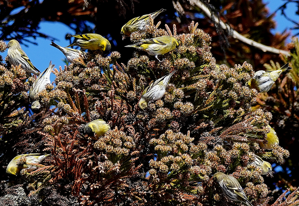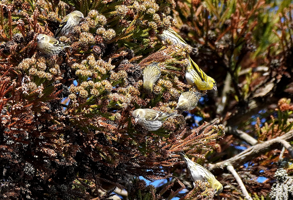 マヒワの群れが杉木に止まり採餌中でした。 五十羽以上でしょうか杉の種子を啄んでいました。 杉の葉に入り込んで姿が隠れているものが多いです。 ただ、何かに驚いて一斉に飛び出しじっとしていません。 強風の翌日には地面に落下した種子を食べています。 雪の上だと良いのですが枯葉や枯れ枝の上です。 それでも大群で見られるのは今のところマヒワだけです。