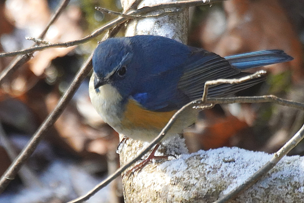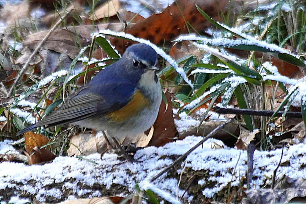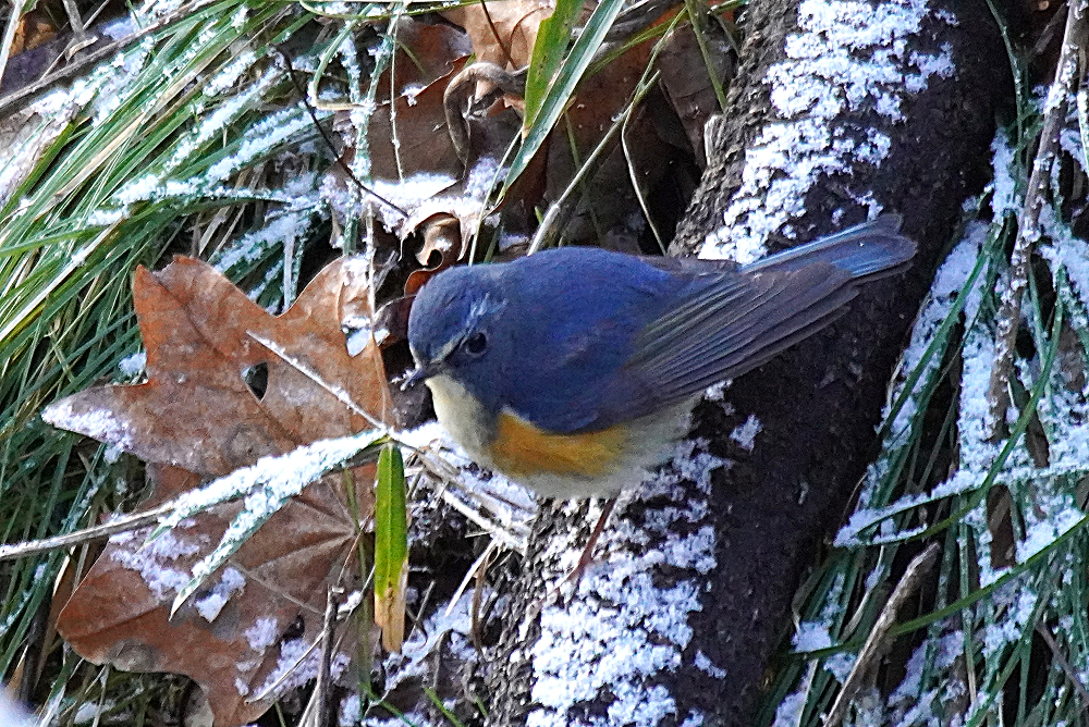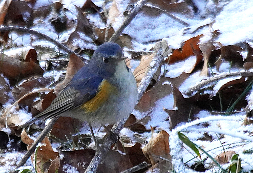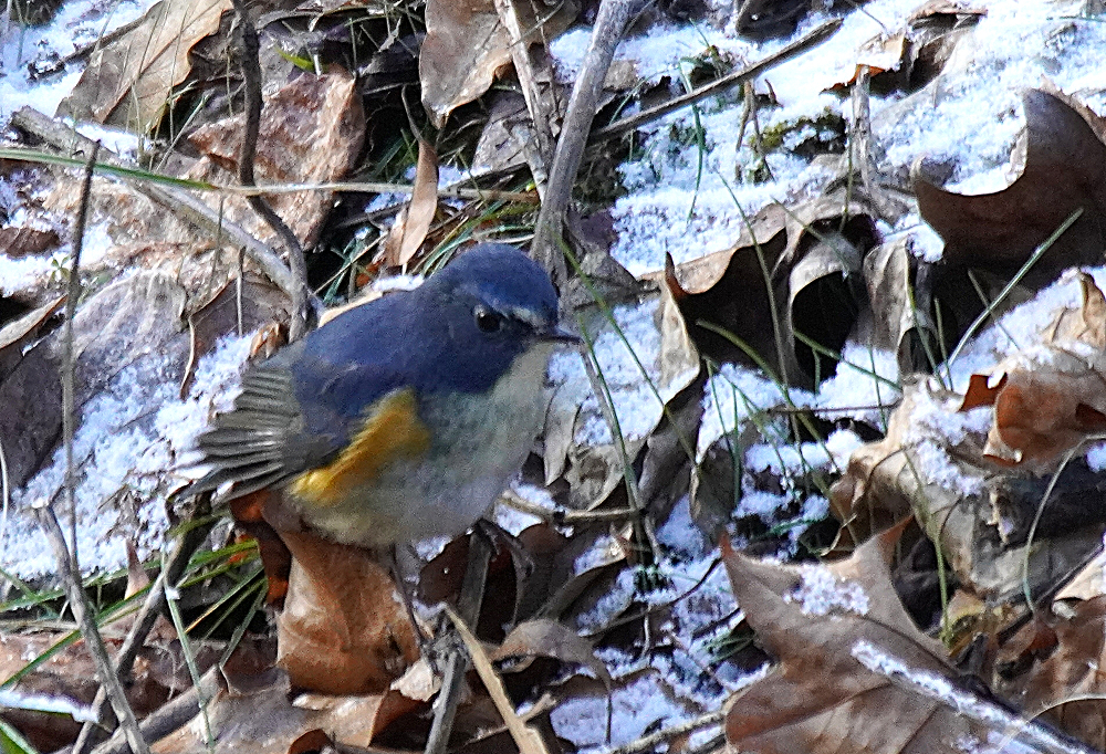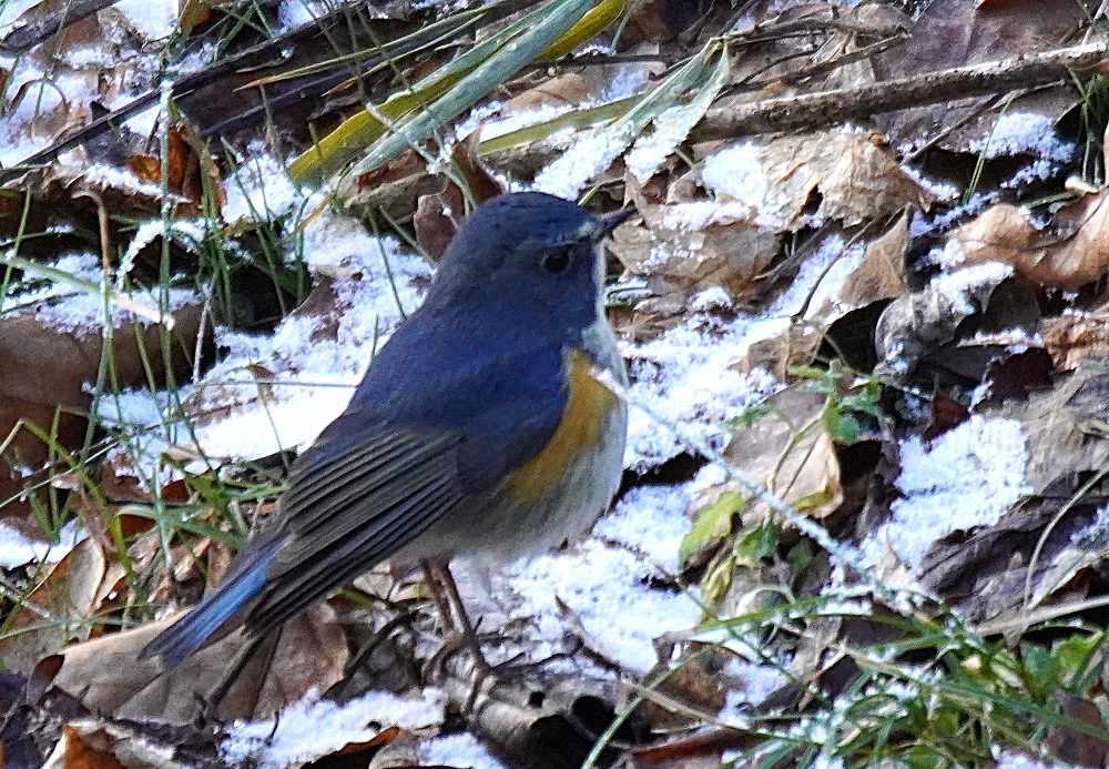 森へ連日通っています。 いつも出会うのはルリビタキです。 オスは数ヶ所で見られ良く出るのは一ヶ所あります。 何回も姿を現し長い時間付き合ってくれます。 直ぐ近くまでやって来て道路や橋の上から眼下に撮れます。 余り人間を恐れることはありません。 少し雪が残っている所を撮りました。
