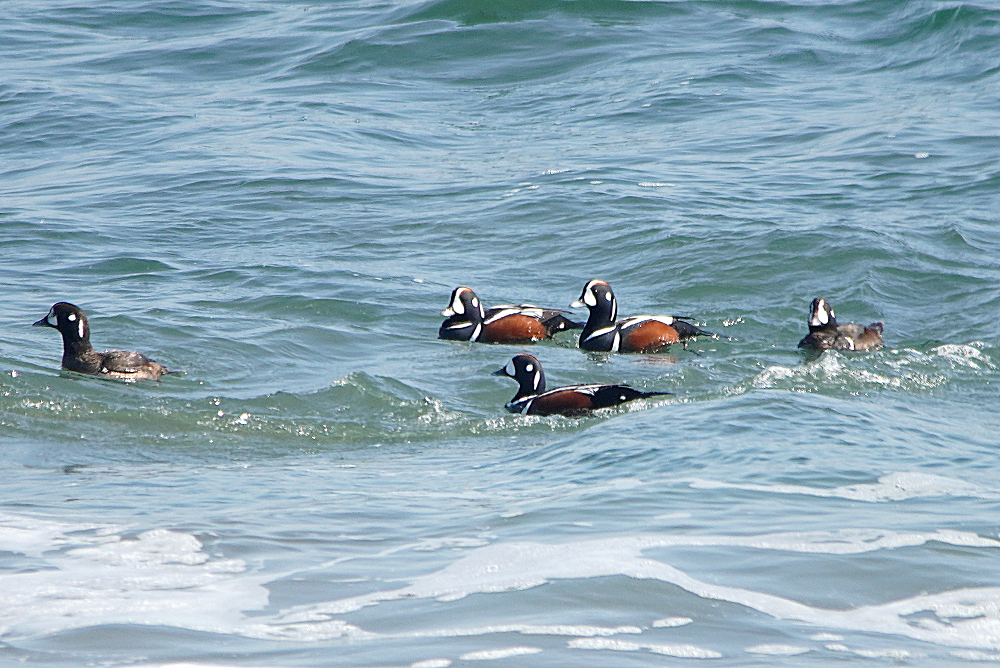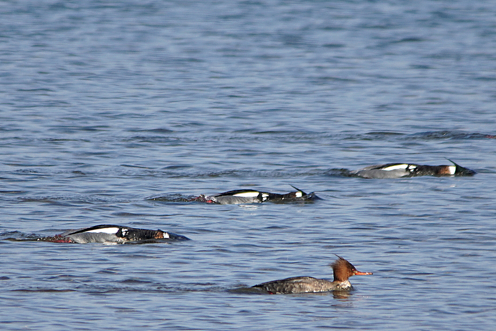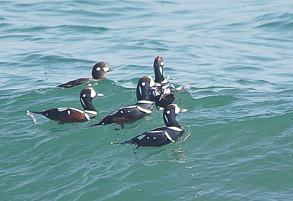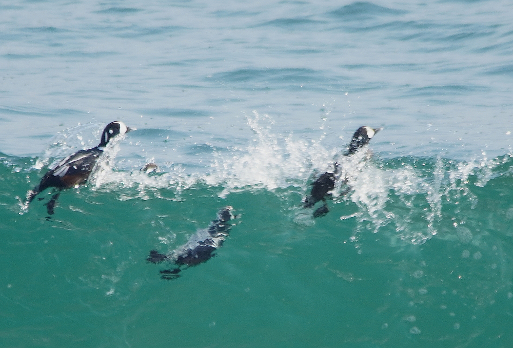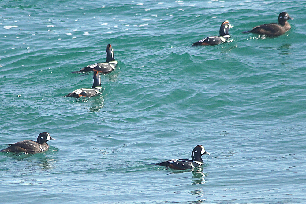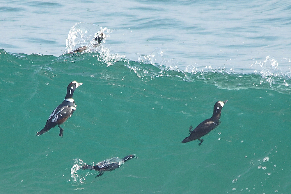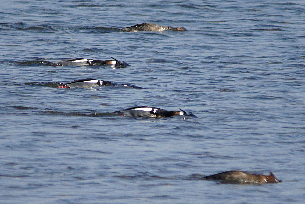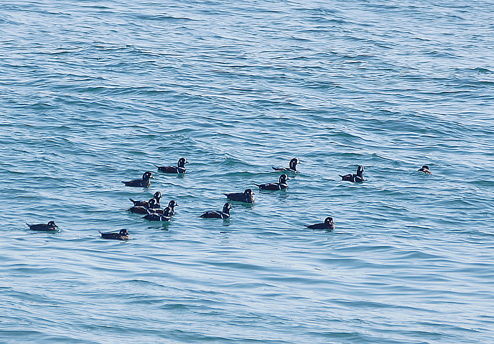 ウミアイサが群れをつくってシュノーケリングをしていました。 浅瀬を水面に浮いた状態で頭だけを水中に入れて泳ぎながら獲物を探しています。 シノリガモが十五羽程の群れで潜水したり波乗りしたりを繰り返していました。 メスが数羽でオスの方が圧倒的に多いです。 お終いはミヤコドリです。