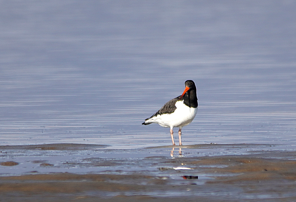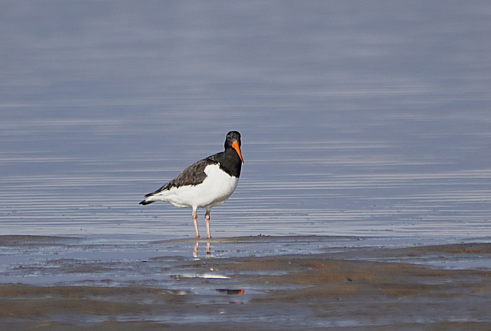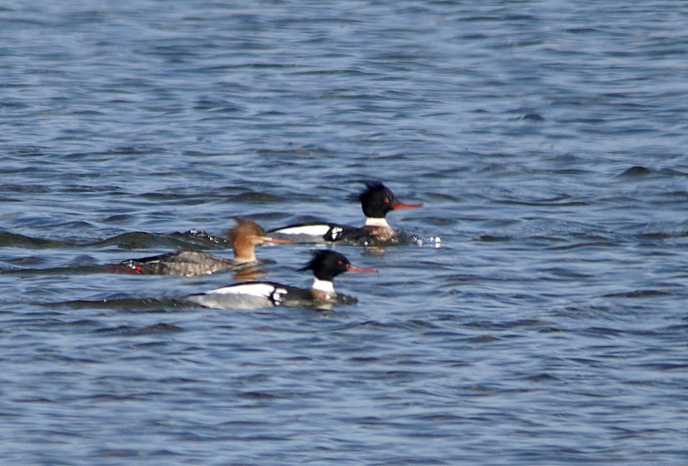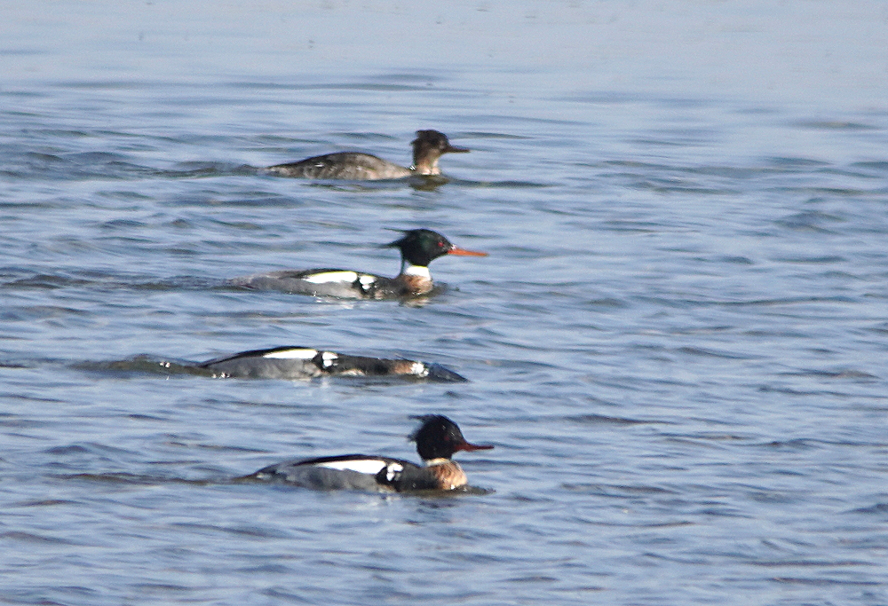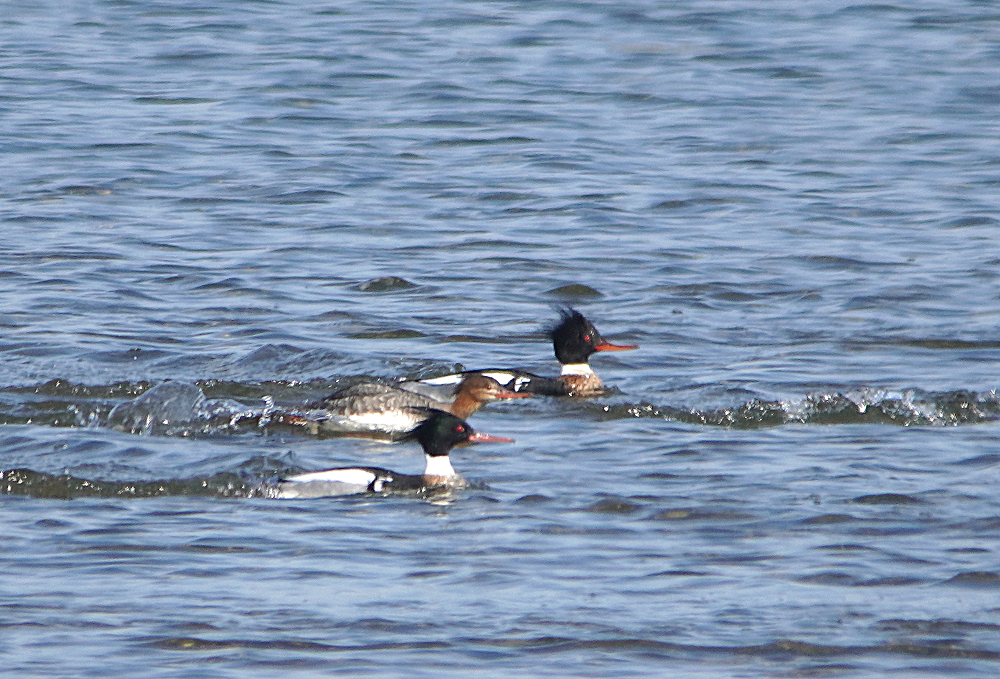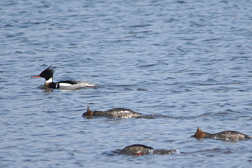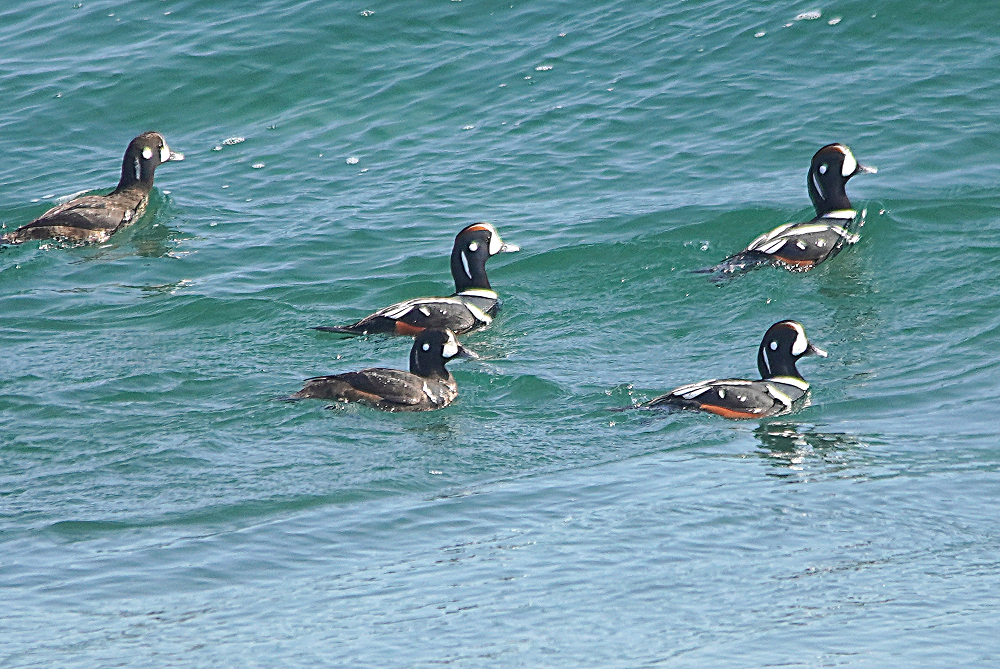 ウミアイサが群れをつくってシュノーケリングをしていました。 浅瀬を水面に浮いた状態で頭だけを水中に入れて泳ぎながら獲物を探しています。 シノリガモが十五羽程の群れで潜水したり波乗りしたりを繰り返していました。 メスが数羽でオスの方が圧倒的に多いです。 お終いはミヤコドリです。