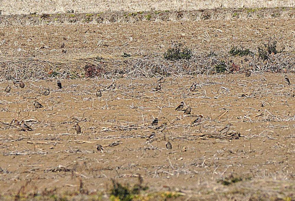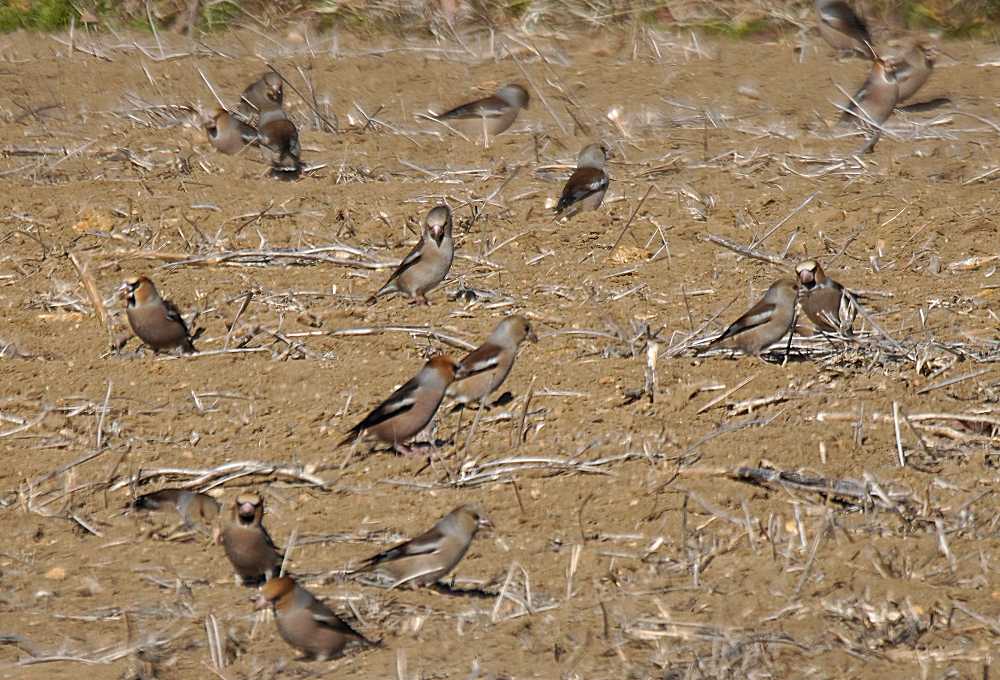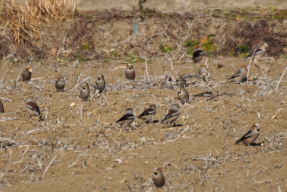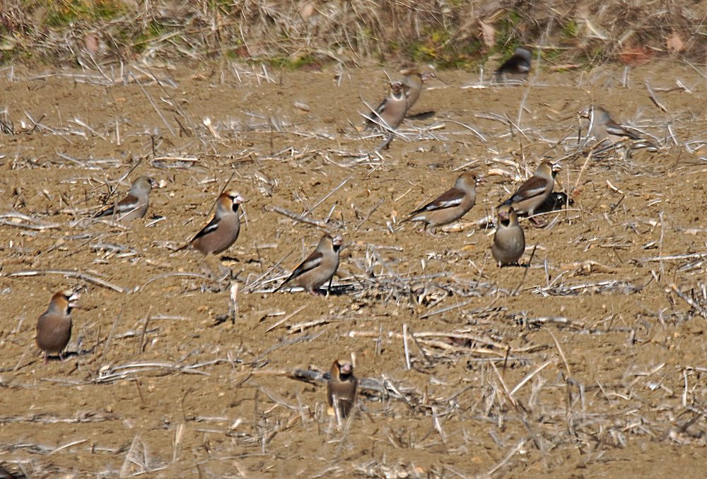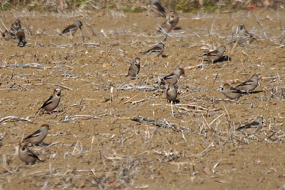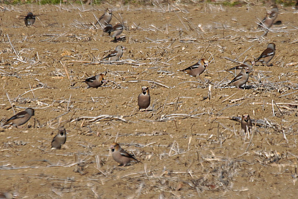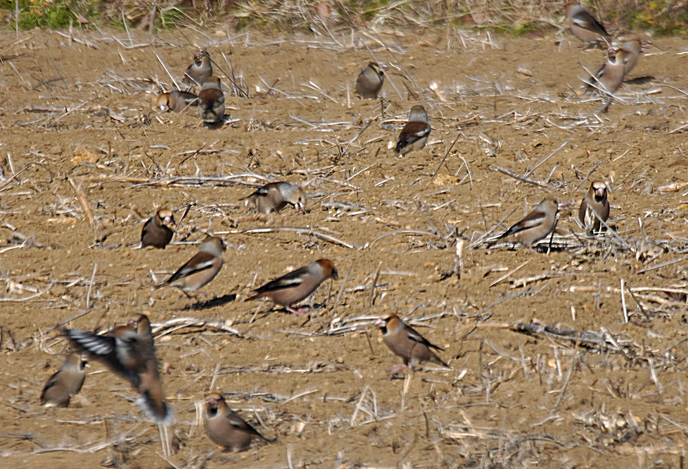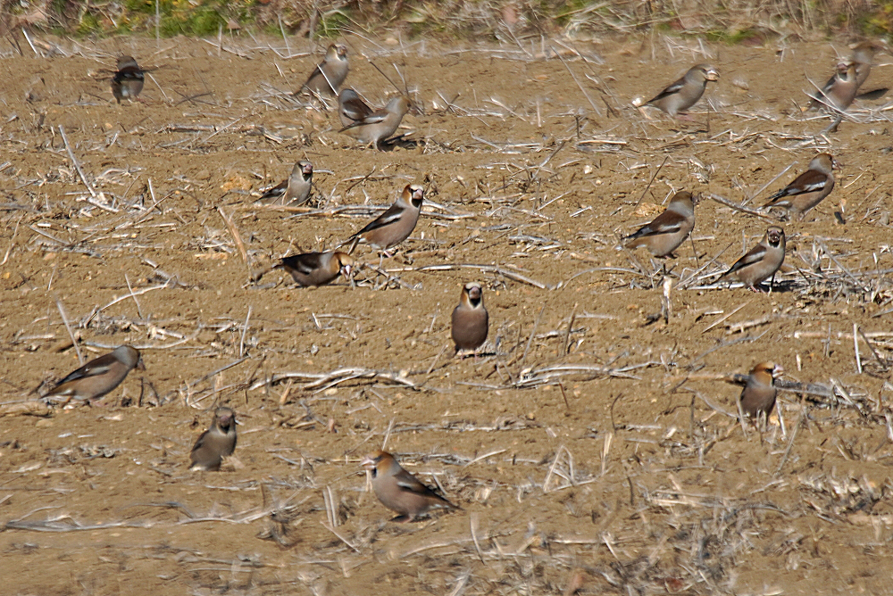 周辺の畑にシメが集結していました。 総勢五十羽を超えるシメが近くの木に止まったり畑に降りて採餌したりの繰り返しです。 越冬中は公園などで単独で観察されますが北へ帰る時期になると集団になるそうです。 シメは目つきが鋭くお世辞にも可愛いとはいえない鳥ですがこれ程まとまると見事です。