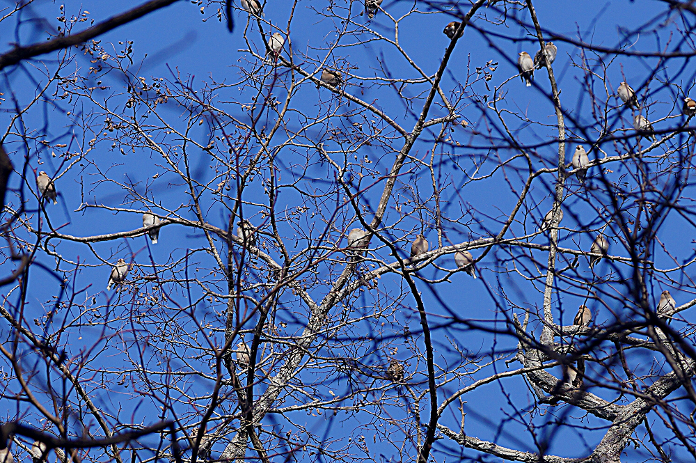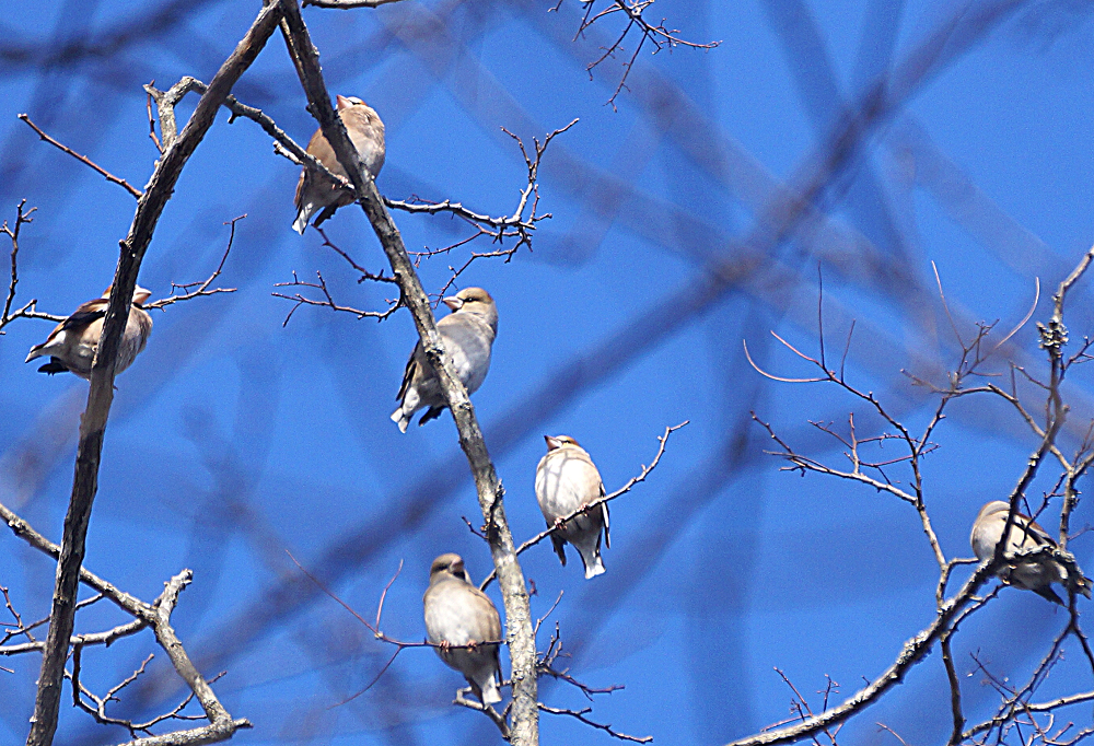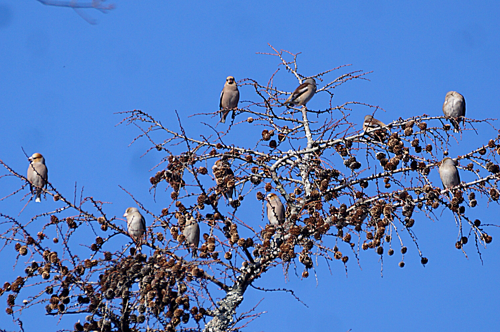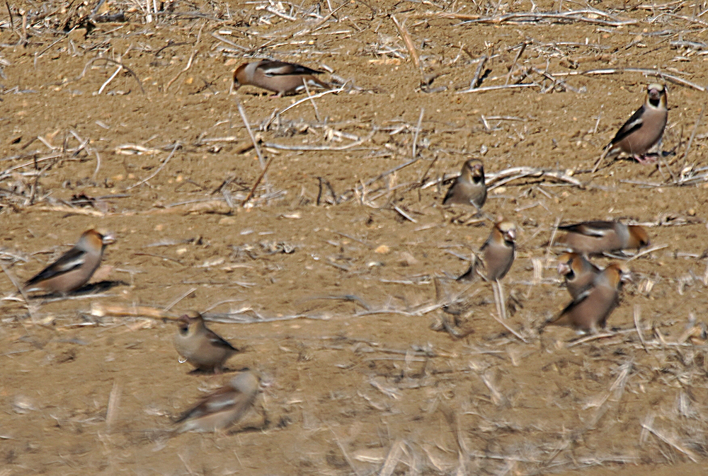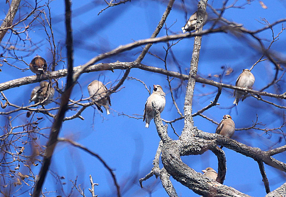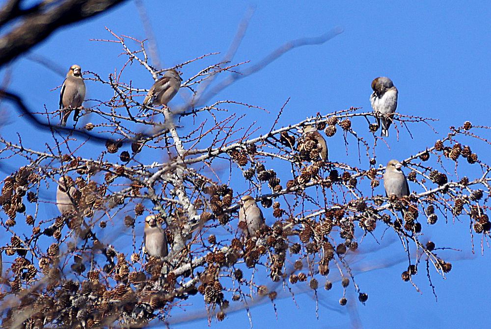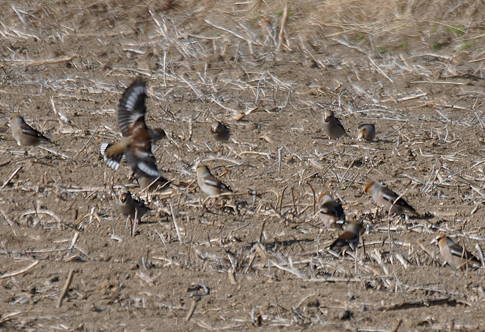 周辺の畑にシメが集結していました。 総勢五十羽を超えるシメが近くの木に止まったり畑に降りて採餌したりの繰り返しです。 越冬中は公園などで単独で観察されますが北へ帰る時期になると集団になるそうです。 シメは目つきが鋭くお世辞にも可愛いとはいえない鳥ですがこれ程まとまると見事です。