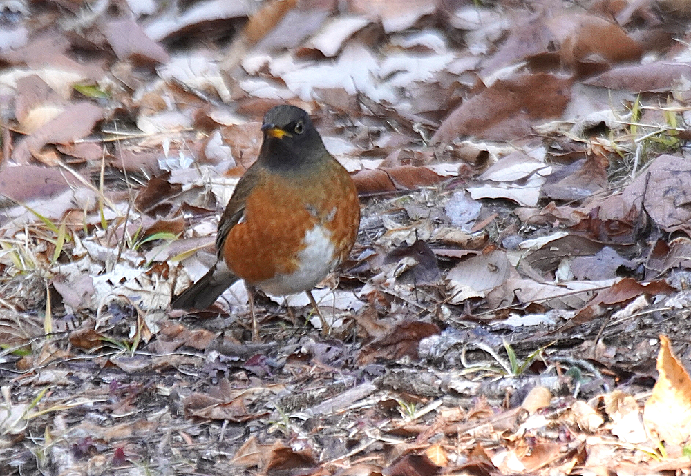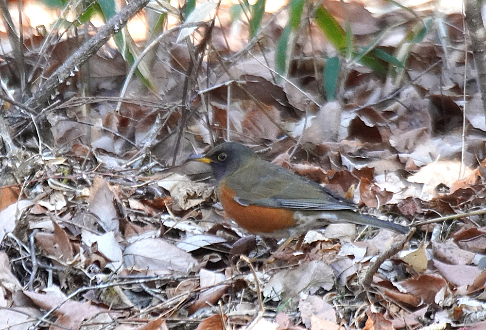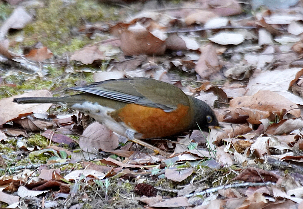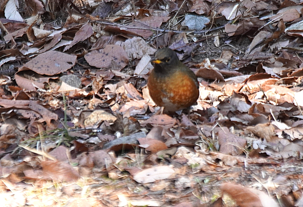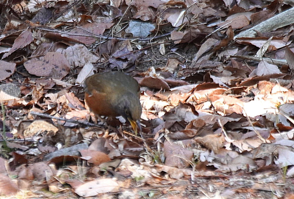 オオアカハラが地上で採餌していました。 林の中で枯葉を嘴で掻き分けて餌を探すのでガサガサという音がします。 居る場所を見つけて頂き表に出て来たところも撮りました。 オオアカハラは頭が黒っぽくアカハラより嘴が大きく長いとあります。 国内で冬期に見られる個体の多くはオオアカハラの可能性が高いということです。