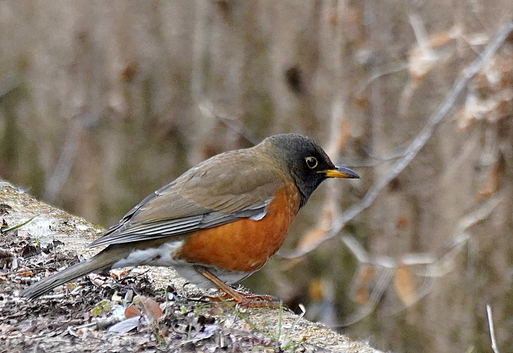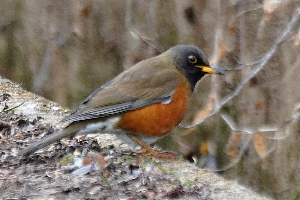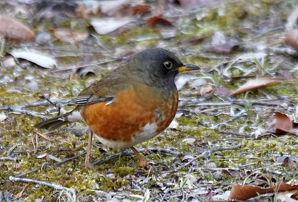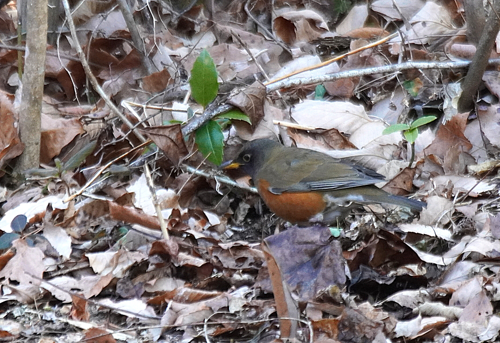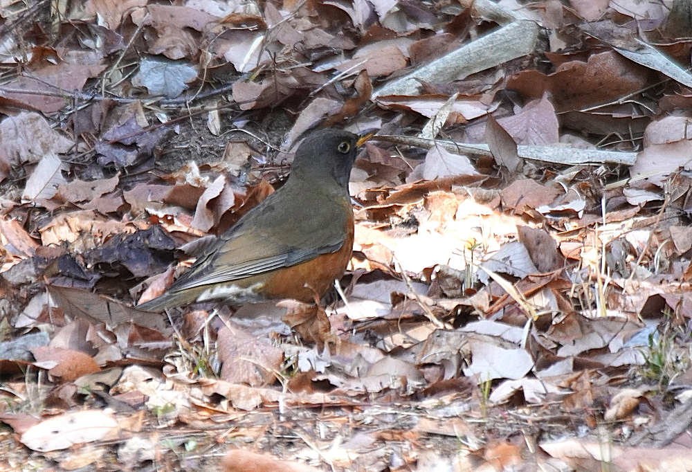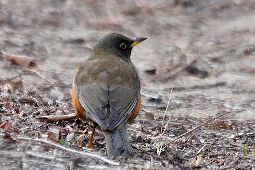 オオアカハラが地上で採餌していました。 林の中で枯葉を嘴で掻き分けて餌を探すのでガサガサという音がします。 居る場所を見つけて頂き表に出て来たところも撮りました。 オオアカハラは頭が黒っぽくアカハラより嘴が大きく長いとあります。 国内で冬期に見られる個体の多くはオオアカハラの可能性が高いということです。